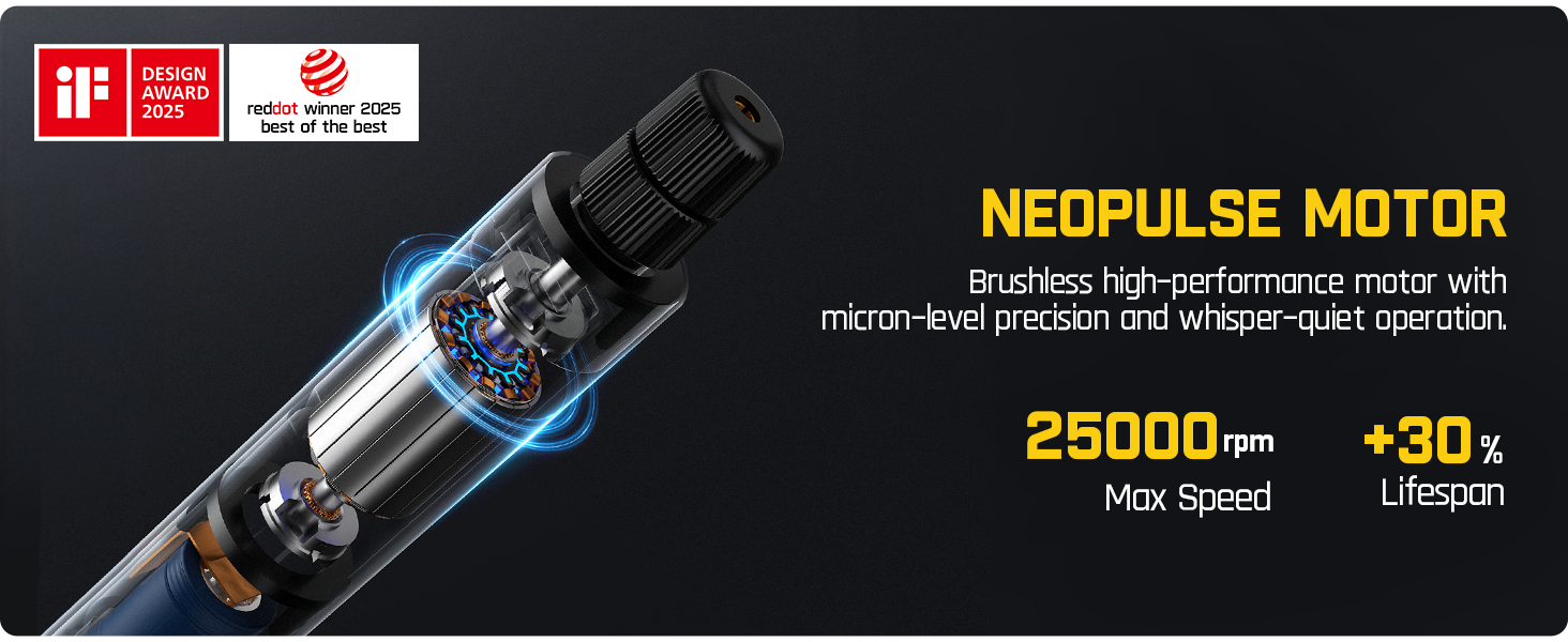 Equipped with a brushless hollow cup motor, this rotary tool runs 30% quieter than standard motors while delivering up to 25,000 RPM.